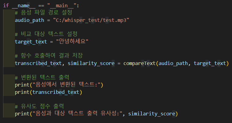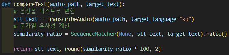 - 수행 사항 : Whisper API를 통해 텍스트화된 데이터와 비교할 텍스트 비교하여 유사도로 점수 산출 함수화(테스트 완료)