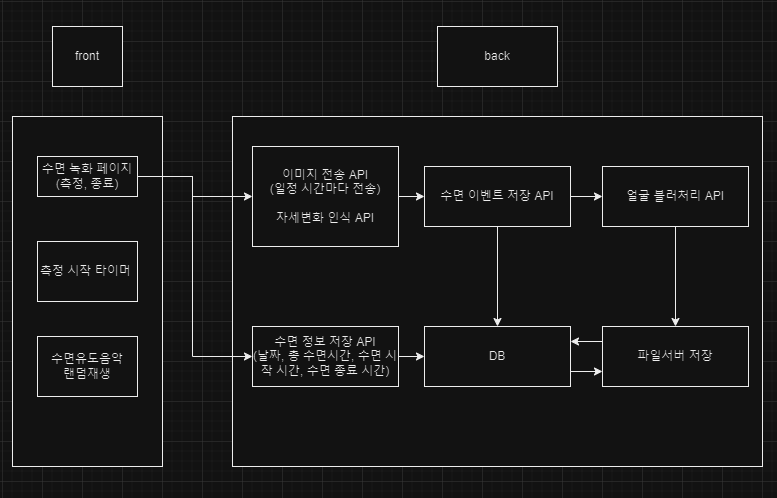 맡게 된 부분은 수면유도음악 랜덤재생, 수면측정, 자세인식 및 변화 감지, 수면이벤트 저장, 저장 시 얼굴 블러처리 개발입니다.