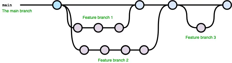 - 새로운 기능을 개발하기 위해 각 개발자는 Main 브랜치에서 분리된 Feature 브랜치를 생성. 해당 기능을 개발하고 작업을 진행