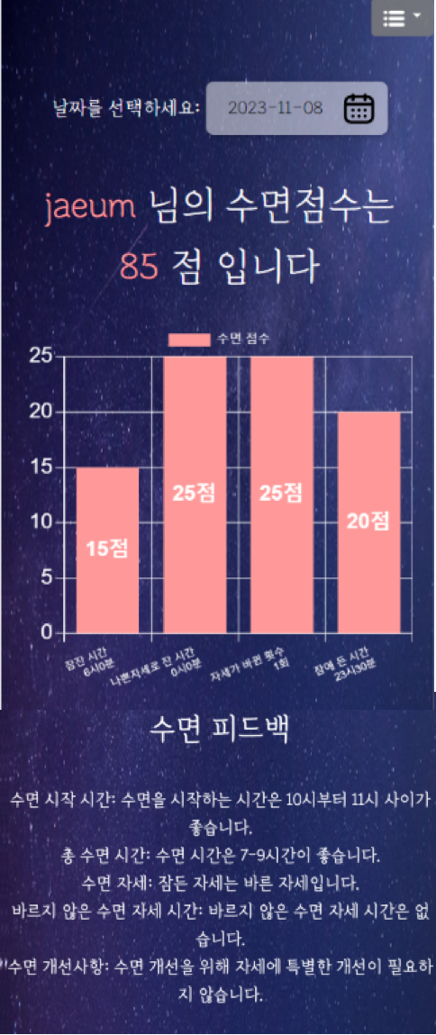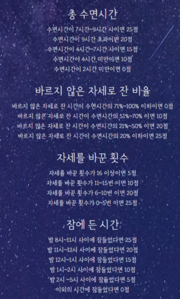 - 4가지 수면기준을 토대로 DB데이터를 사용하여 일일 점수 계산