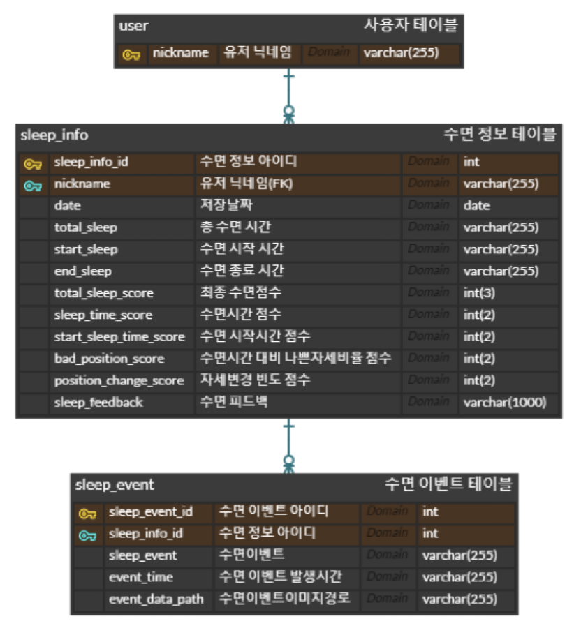 - 촬영 종료 후 DB의 수면정보테이블과 수면이벤트테이블을 join하고 select하여 필요데이터(수면 시작 시간, 수면 종료시간, 총 수면시간, 수면이벤트, 수면 이벤트 발생시간) 추출