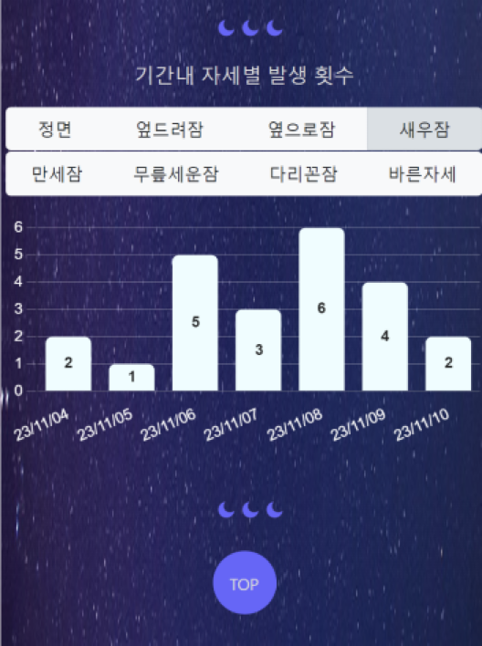 - DB데이터를 사용하여 일, 주, 월, 연단위로 각종 수면 통계자료 확인 가능