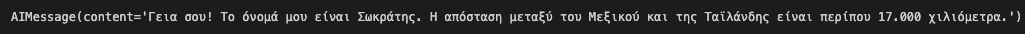 HumanMessage(content="What is the distance between Mexico and Thailand. Also, what is your name?"),
