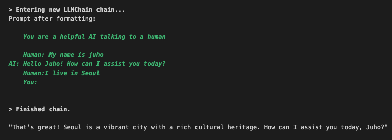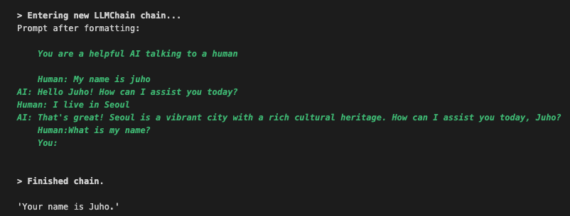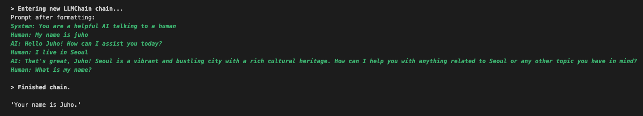 위 과정을 통해 대화 내용이 저장되고 이전에 대화 내용을 기반으로 답변을 해주는 것을 확인해 볼 수 있다.