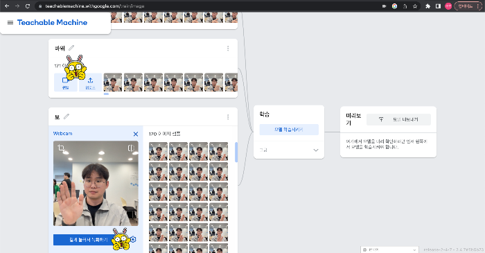 학습시킨 모션을 취하면 가위, 바위, 보를 인식해 모션을 알려줌